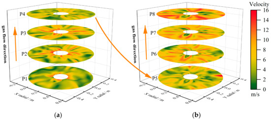 The flow field inside the furnace has a significant impact on combustion and boiler emissions, especially on the temperature distribution inside the furnace, which is an important basis for emissions and other indicators. Therefore, analyzing the distribution characteristics of the flow in the furnace is of great significance. As shown in Figure 4, the velocity cloud maps are created on section P1–8 of the burner area based on the calculated data to analyze the flow field inside the furnace. Due to the cylindrical structure of the fully premixed burner, the cross-section smoke flow direction cloud diagram shows a “fan blade” shape.