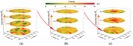 Cloud map of cross-sectional velocity field at the rear of the furnace. (a) Velocity cloud maps of cross-section P9–12; (b) velocity cloud maps of cross-section P13–15, (c) velocity cloud maps of cross-section P16–18.
