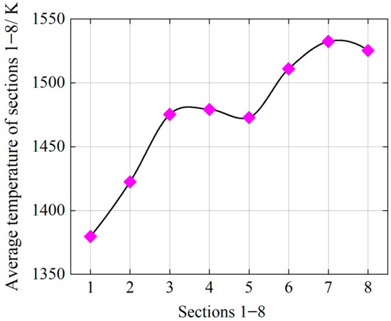 At plane 5, a spoke-shaped low-temperature zone appears again in the temperature area because the nozzle is located at the second strip nozzle and there is no mixed gas spraying at the top of the strip nozzle, resulting in a local temperature decrease. However, the overall temperature level of the cross-section is higher than that of plane P1. As the airflow flows towards the rear of the combustion tube, the high-temperature area in plane P6 further expands, with a slight increase in temperature compared to the previous planes (P1, P2, P3, P4, P5). The high-temperature area in plane P7 expands to its maximum, and the temperature development trend in the combustion tube area can be seen more clearly from the comparison of the average temperature of each plane in the combustion tube area, as shown in Figure 14. As shown in Figure 14, the minimum temperature on planes 1–8 is 1106.7 °C (on plane P1) and the maximum temperature on plane P7 is 1232.4 °C. Specifically, since plane P1 is located in the front of the combustion cylinder, less combustible gas enters the furnace and, thus, the combustion temperature is relatively low. With the continuous flow of combustible air into the furnace, the average temperature of section P4 gradually increases. The temperature rise of section P4 is smaller than that of section P3 because there is no air inlet at the back of section P4, resulting in a smaller gas flow in this section. As a result, the combustion temperature of the whole section does not increase much compared with that of section P3. Due to the lack of gas openings in the front of section P5, the average temperature of the section relative to P4 is slightly decreased. The average temperature is gradually increased on subsequent sections P6/P7, and the temperature of section P8 is slightly decreased compared to P7, but the decrease is not significant. This is because P8 is located at the tail of the combustion tube and the gas flow rate is relatively reduced. However, due to its location in the middle of the furnace, both front and back are in the combustion vigorous zone so the temperature changes relatively little compared to P7.