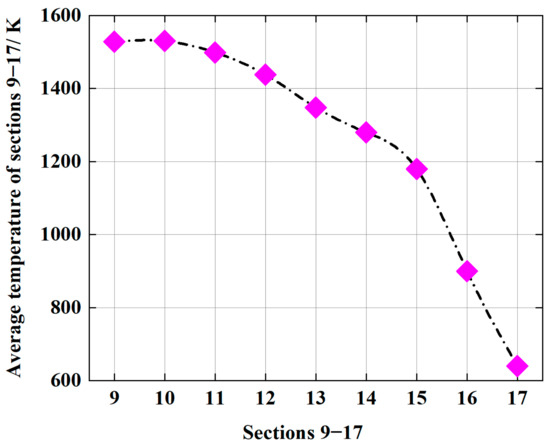 In order to more accurately analyze the temperature distribution characteristics on planes P9–P17, the average temperature values on each cross-section were taken for comparison, as shown in Figure 16. From the figure, it can be seen that the average temperature on planes P9, P10, and P11 continues to increase compared to the average temperature on P8. Specifically, the average temperature of plane P10 reaches the maximum value of 1257.7 °C and the temperature levels on sections P9 and P12 are equivalent, which is slightly lower than section P10 at 1255 and 1227 °C. From this, it can be seen that the position of the combustion center in the furnace is near section P10. Afterwards, the average temperature of each section gradually decreased until the average temperature on section P17 dropped to 336.7 °C. On section P9–P13, the temperature decrease is relatively slow, exceeding that of section P13 (P14–P17), and the temperature decrease is relatively rapid, indicating a decrease in combustion intensity in the furnace. It also proves that the flame length of the natural gas combustible mixture’s combustion is short and the temperature distribution in the furnace is relatively uniform. The temperature drops to 180 °C at the outlet of the furnace.