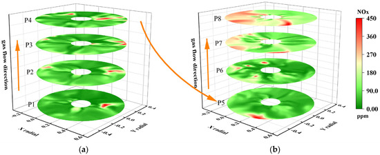 As shown in Figure 20, on the planes P9–P12 outside the combustion chamber, the NOx content gradually decreases along the airflow direction, but the decrease is not significant. The highest NOx value on the four planes reaches 300 ppm. On planes P9–P11, there is a significant amount of NOx production, with a converted NOx volume content of 162 mg/m3. The airflow continues to flow towards the tail of the boiler, reaching the P13–P15 planes. Compared to the P9–P12 planes, the NOx generation is significantly reduced. The main reason is that the flame front is located near P10, and the position of P13–P15 is far from the flame front. The temperature on the entire plane decreases, resulting in a smaller temperature-type NOx production. The highest NOx value on plane P13 is 280 ppm, and the highest value on plane P14 is 260 ppm. On plane P15, the NOx value decreases to 231 ppm. The airflow continues to flow towards the tail of the boiler, reaching the P13–P15 planes. Compared to the P9–P12 planes, the NOx generation is significantly reduced. The main reason is that the flame front is located near P10, which is far from the flame front position. The temperature on the entire plane decreases, resulting in a smaller temperature-type NOx production. The highest NOx value on plane P13 is 280 ppm, and the highest value on plane P14 is 260 ppm. The value on plane P15 decreases to 231 ppm.