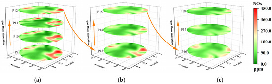 Cloud map of cross-sectional temperature field at the rear of the furnace. (a) Temperature cloud maps of cross-section P9–12; (b) temperature cloud map of cross-section P13–15; (c) temperature cloud maps of cross-section P16–18.