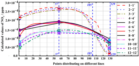 On each straight line segment shown in Figure 21, 129 points were continuously and uniformly selected, and the calculated values of NOx at each point were extracted. The trend of the calculated values is shown in Figure 22. From the figure, it can be seen that among the twelve three groups of straight lines, the outer four lines, 1-1′, 2-2′, 3-3′, and 4-4′, have higher calculated NOx values than the other two groups of straight lines before point 105. The trend of NOx generation values calculated on these four lines is consistent. Specifically, the minimum NOx generation value at the inlet of the burner on each straight line is 200 ppm. Afterwards, the NOx generation value gradually increases. At point (number 57), the calculated NOx generation value reaches its maximum, and the maximum calculated NOx on the four lines is 270 ppm. As the gas flows towards the rear of the boiler, the calculated NOx value on the four outer straight lines gradually decreases, but the decrease amplitude increases compared to the first 57 points and reaches point 129 at the rear of the furnace. The calculated value of NOx is the lowest among the four straight lines, which is 10 ppm. If converted into a mass volume content, the value is 20.5 mg/Nm3. For the four straight lines located in the middle of the plane, namely lines 5-5′, 6-6′, 7-7′, and 8-8′, the calculated NOx values have decreased compared to the four outer straight lines, and the change in NOx calculated values has slowed down. Specifically, the lowest calculated NOx value for the four straight lines at the burner inlet, i.e., the starting point of the straight line, is 110 ppm. At point 57 of the straight line, the highest calculated NOx value reaches 197 ppm, and then the calculated NOx value gradually decreases, As the flue gas continues to flow towards the rear of the boiler, the minimum calculated value of NOx at point 129 is 80 ppm. For the four innermost straight lines, 9-9′, 10-10′, 11-11′, 12-12′, the calculated NOx value continues to decrease compared to the four central straight lines. At the burner inlet, the lowest calculated NOx value is 40 ppm, and at point 57, all four straight lines reach their maximum, with a maximum value of 130 ppm. Afterwards, the calculated NOx value gradually decreases and the decrease is not significantly different from the growth before point 57. At point 129, the calculated NOx value reaches its lowest, with a minimum value of 40 ppm. Taking a comprehensive view of the 12 straight lines, the calculated values of NOx show a trend of first increasing and then decreasing. At point 57, the calculated values of NOx reach their maximum value and continue to decrease until the end of the line segment. Among the 12 straight lines, the outer 4 straight lines have the largest decrease after point 57. This is because the end points of the 12 straight lines are located on the same plane. At the tail of the boiler, due to the increasing trend of the airflow converging towards the chimney, the outermost flue gas-containing NOx converges towards the chimney, Thus, the NOx gas at the endpoint of the outermost segment flows towards the chimney, resulting in a lower calculated NOx value at the end of the outermost segment compared to the middle and inner NOx values. Among them, the NOx value calculated from the innermost side is closest to the NOx emission value at the chimney. Therefore, the calculated values at the ends of line segments 9-9′, 10-10′, 11-11′, and 12-12′ are closest to the NOx emission values at the furnace outlet. The minimum value of NOx at the ends of the four line segments is 33 ppm, which is converted into a volume content of 40.2 mg/m3. Due to the close distance from the chimney, the NOx value is relatively close to the final emission value. If the furnace outlet temperature is 180 °C, the final emission mass volume content is 26.6 mg/Nm3. The above calculations indicate that the NOx export emission value has met the strict emission standards in the Beijing-Tianjin-Hebei region.
