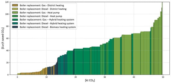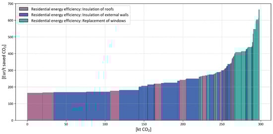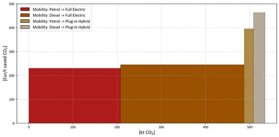 Focusing on the results of the analysis for South Tyrol, the MAC curve analysis indicated that boiler replacement incentives are the most cost-effective for generating CO2 emission reductions, albeit with the lowest emission reduction potential. In fact, the buildings to which these incentives can be applied are very limited as the incentives are limited to apartment blocks that are not in district heating areas. These measures are followed by specific residential energy efficiency incentives, particularly those associated with the insulating roofs and external walls of single-family houses built before 1980. It is noteworthy that the cost-effectiveness of residential energy efficiency measures in apartment buildings or multi-family houses is only marginally inferior (about 20%) to the mobility sector measures. In contrast, mobility incentives, particularly those promoting a shift from petrol or diesel-powered vehicles to full electric ones, demonstrated the highest potential for CO2 emission reduction as the majority of vehicles in the province are based on internal combustion engines and the share of full electric vehicles is still very low. It should be noted that this result is significantly influenced by the assumption that a large majority (80%) of people replacing their petrol or diesel car would opt for a full electric vehicle, with a smaller fraction (20%) choosing a plug-in hybrid. This assumption may be subject to change based on evolving consumer preferences and technological advancements in the automotive industry.
