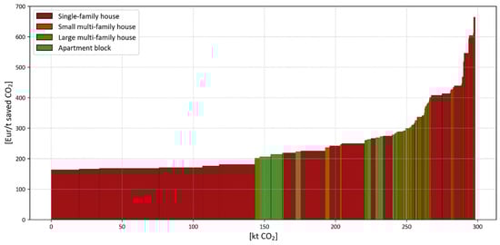 2 reductions per euro spent, making them the most cost-effective. However, their overall emission reduction potential was limited as the incentive is limited to apartment blocks that are not in district heating areas. These are followed by measures for the insulation of the roofs and external walls of single-family houses built before 1980. Next come the measures for the insulation of the roofs and external walls of apartment buildings built before 1980. Immediately afterwards are mobility incentives for a transition from a petrol- or diesel-powered vehicle to a full electric one. The other interventions for residential energy efficiency, mainly those related to the insulation of roofs and external walls in apartment blocks or large and small multi-family houses, only differ by about 20% in terms of cost-effectiveness in reducing CO