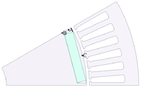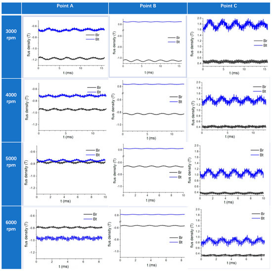 In the weak magnetic area (3000 rpm~6000 rpm), the flux density at three specific positions on the rotor is analyzed over time for rotational speeds of 3000 rpm, 4000 rpm, 5000 rpm, and 6000 rpm. The locations of points A, B, and C are illustrated in Figure 1 where points A and B reside on the q axis while point C resides on the d axis.