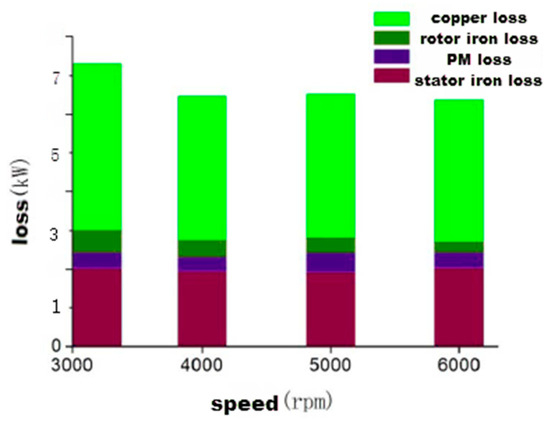 Therefore, it can be calculated that the electromagnetic losses are 9.5 kW and 8 kW, which is basically consistent with Table 3 (8.13 kW and 7.75 kW, respectively). The errors are 15% and 3%, respectively.