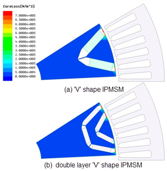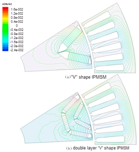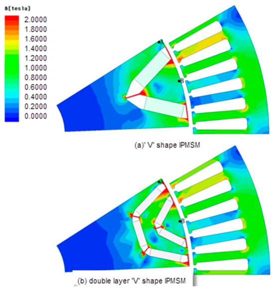 Only the rotor structure was changed for the two motors. The magnetic field distribution of V-type and double V-type IPMSMs under rated load (3000 rpm and 1110 Nm) is shown in Figure 7.