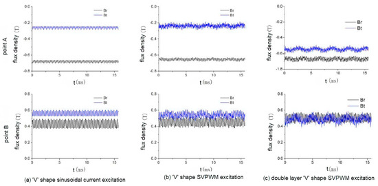 Figure 9 shows the flux density waveform at points A and B on the rotor under rated load; Figure 9a,b are the flux density waveform of the V-type IPMSM under the load of sinusoidal current source and SVPWM. By comparison, it can be seen that the calculated flux density changes are smooth under the condition of a sinusoidal current source and the time harmonics under SVPWM loading increase significantly. In the process of motor design, if only the motor loss under the load of a sinusoidal current source is considered, it is likely that the rotor heat dissipation design is unreasonable due to the small rotor loss; even the motor is damaged due to the rotor overheating. Figure 9b,c shows the flux density waveforms of V-type and double V-type IPMSMs under SVPWM loading. Under rated load conditions, the flux density amplitude at point B on the d-axis is very close but the amplitude of double V-type IPMSMs fluctuates more.