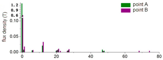 The amplitude of flux density harmonic components at point A and point B of the sinusoidal current source and SVPWM-rated load of V-type IPMSM is shown in Figure 13. As can be seen from the figure, similar to the situation of A-phase harmonic current, the higher harmonics under the sinusoidal current source are less while the flux density harmonics under SVPWM are more.