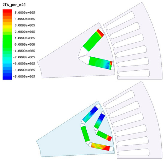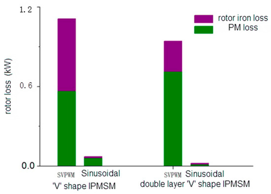 The rotor permanent magnet current density under SVPWM excitation at a certain time is shown in Figure 16 and the rotor loss under sinusoidal current source and SVPWM excitation is shown in Figure 17. As can be seen from the figure, the rotor loss under the sinusoidal current source is very small which is inconsistent with the actual situation. In the process of studying rotor loss, the results of the sinusoidal current may seriously underestimate the temperature rise of the rotor. Under the excitation of SVPWM, the loss of permanent magnet of double V-type IPMSM is higher than that of V-type. However, relative to the reduction in stator current time harmonic component, the flux density harmonic component in the stator rotor core is also reduced and the rotor core loss of the double V-type IPMSM is much lower than that of the V-type.