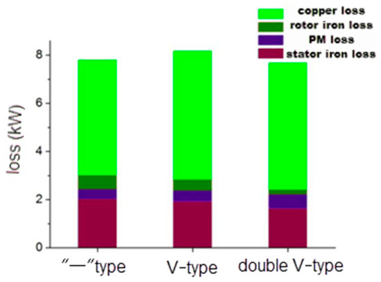 The losses of “一”-type, V-type, and double V-type IPMSMs are shown in Table 3 and Figure 19. The loss changes (%) of V-type and double V-type are based on the “一” type. As can be seen, the rotor core loss of the V-type and double V-type IPMSMs is significantly reduced compared to the “一” type. Even if the loss of permanent magnet is increased, the total rotor loss is still reduced. The way of optimization is to change the arrangement of permanent magnets. The change in magnetic circuit and the increase in magnetic leakage inevitably lead to the reduction in back EMF of no-load. Under the same load requirements, the copper loss increases with the increase in the current and the eddy current increases with the increase in the time harmonic current. However, after optimization, the air gap flux density is closer to sine and the reduction in space harmonics leads to the reduction in stator core loss and rotor core loss. Compared with the “一” type IPMSM, the winding loss of the V-type is increased and the core loss is reduced. The core loss of the double V-type IPMSM is significantly reduced.
