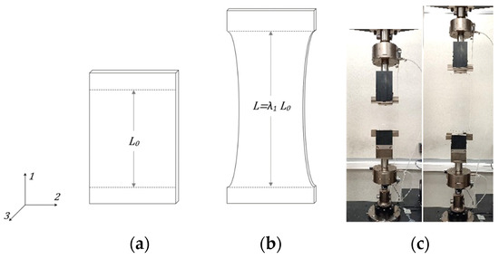 Figure 2. Tensile test sample: (a) unloaded; (b) stretched to λ 1 ; (c) corresponding experimental setup. Axes of the coordinate system are denoted as 1, 2, and 3.