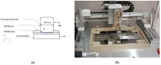 Then, the elastomer film is immersed in a silicone fluid to prevent flashover. For the ground electrode, a 40 mm diameter cylinder of stainless steel 304 is used (Figure 4a), for which all edges have been rounded to a 3.2 mm radius, such as limiting electric field enhancement at that location [13,26]. This electrode is actuated by a 3-axis motor to the first testing location, where the cylinder is deposited on the dielectric elastomer, and only the mass of the cylinder contributes to the contact pressure at the film interface. Subsequently, a positive DC voltage V is applied across the dielectric elastomer using a ramp of 500 V/s. Assuming that the thickness is uniform across the tested location, the electric field E across a linear membrane is obtained from the initial dielectric thickness as E = V / d 0 . The breakdown voltage V B D is detected from a sharp increase in the current measurement, and the corresponding DBS is calculated from (1) [27].