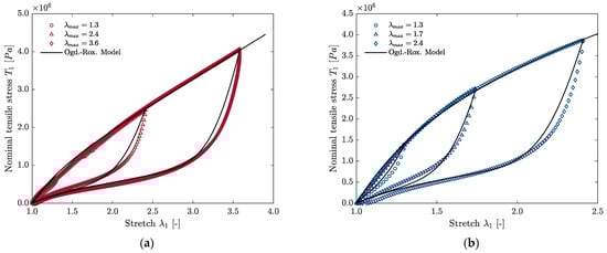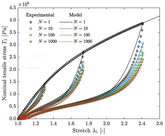 Parameters A = 0.24 and B = 0.25 were calculated, such as minimizing the error between the evolving experimental tensile stress and the stress derived from the modified Ogden–Roxburgh model (Figure 8). This approach constitutes a convenient way to model the experimental results but is only valid if the maximal stretch remains constant during the fatigue experiment. In the case of more complex random loadings, a different softening is expected, which would require the implementation of more sophisticated constitutive models.