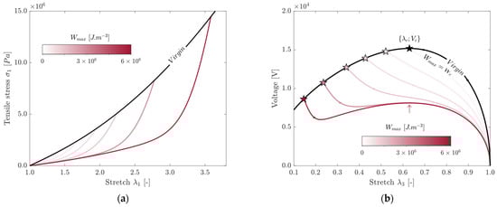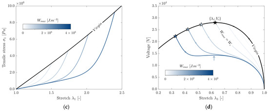 When considering a sample that has been stretched prior to the breakdown experiment, the Mullins effect alters the material’s response to electrical stress, and the resultant voltage curve follows a different path before recovering one of the virgin materials. If the historical strain energy density W m a x applied in the tensile experiment is below a threshold W c , no consequence is predicted for the breakdown, as the irreversible critical point is identical to the point of the original virgin material. However, if W m a x   of a material has been raised above W c in its loading history, its voltage curve will not pass through the instability point and will recover the curve of the virgin material in an unstable region (where thickness collapses without the need for additional voltage). This leads to breakdown voltages lower than V c initiated at the locations of the colored stars, presented in Figure 6b,d.