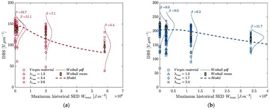 To confirm the theoretical predictions from the proposed model, the experimental DBS was measured for various values of maximum historical SED obtained from the tensile test experiment (Figure 7). The reported breakdown values for both model and experimental data were obtained from (1). For each individual mechanical loading case, the Weibull probability density function of the experimental electrical failures (2) is represented vertically. For the virgin sample and the first loading case of the 70 ShA elastomer, electrical breakdowns were not reached for all the testing locations due to the voltage limitation of the DC power supply. These corresponding data were treated as suspensions in the evaluation of the Weibull parameters and are represented by upward arrows in Figure 7b. For the virgin 50 ShA material, the mean of the experimental failure was measured at E ¯ = 140 ± 6   V · µ m 1 , whereas for the 70 ShA material, a significantly higher DBS of E ¯ = 224 ± 9   V · µ m 1 was obtained (uncertainties were determined from the two-sided 95% confidence bound interval). This increase in the DBS was anticipated by the EMI model introduced in Section 3.2 due to the substantial variation in mechanical properties between the two elastomers considered. For the 50 ShA material, the model predicts a breakdown value of 145 V·µm−1, and that value is contained within the confidence bounds of the experimental results. For the 70 ShA material, a breakdown strength of 205 V·µm−1 is calculated for a virgin material, which is only 8% lower than the mean experimental value. The historical SED threshold under which no consequence is expected on the DBS has been verified experimentally as the mean DBS of the samples previously stretched to λ m a x = 1.3 are very similar to the ones of the virgin materials ( E ¯ = 135 ± 6 V·µm−1 for the 50 ShA and E ¯ = 210 ± 7 V·µm−1 for the 70 ShA). Above this threshold, the overall feature of the Mullins damage is also predicted accurately compared with experimental data obtained for the most severe loading cases. This finding confirms that breakdown is initiated at the location of the stars, and the local instability observed on the highly stretched samples is not causing a breakdown. The behavior observed here supports previous works [11] where it was found that pull-in instability does not necessarily imply an electrical failure. The Mullins damage is found to cause a plateau in the stretch–voltage curve (Figure 6b,d). This feature is interesting for dielectric elastomer actuators for which obtaining a large stretch amplitude from a low voltage variation is desirable from a transducer efficiency perspective. Although a preliminary stretch of the elastomer beyond its operating domain can be used to enhance its actuation response, further measurement would be required to conclude whether the plateau could be exploited or not. The instability phenomenon might lead to localized inhomogeneous deformation, which is known as creasing, cratering, snap-through, or wrinkling, and the typical distance between creases was found to be approximately the same as the thickness of the film [32]. In our experimental setup, the electrode covers a relatively wide surface (40 mm diameter), and the actuation region is hidden underneath the steel cylinder, preventing direct observation of the actuation mechanisms.