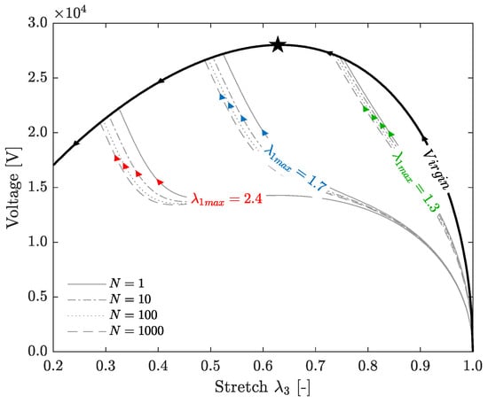 Using this modified damage parameter in (8) allows us to predict the evolution of the EMI in the stretch–voltage diagram based on the number of cycle repetitions (Figure 9). For the lower stretch amplitude ( λ 1 m a x = 1.3 ), the location of the critical instability is found unaffected as the instability is identical to the snap-through of the virgin material, as represented by the black star in Figure 9. For the larger stretch amplitudes, only minor reductions in the breakdown voltage are expected after mechanical fatigue, as the location of the snap-through is marginally modified compared to a sample stretched only once ( N = 1 ). In other words, the softening caused by the Mullins effect predominantly contributes to the location of the EMI, whereas the role of fatigue softening appears negligible.