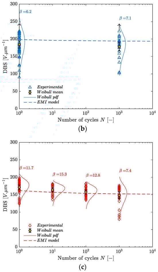 Figure 10. Evolution of the dielectric breakdown strength with mechanical cycling after a maximal stretch of: (a) λ 1 = 1.3 ; (b) λ 1 = 1.7 ; (c) λ 1 = 2.4 .