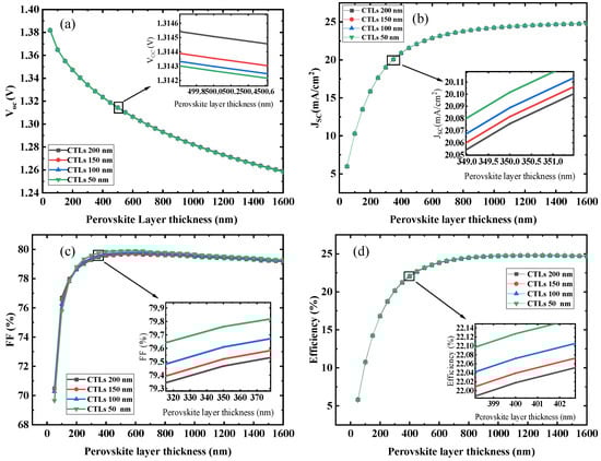 The thickness of the active or photon-absorbing layer (MAPbI3) has significant impacts on the PSC’s performance. A very thin absorbing layer harvesting a small portion of the photons create a smaller number of electron-hole pairs which directly reduce the efficiency of the solar cell. In contrast, a very thick absorber layer lowers the cell’s efficiency due to recombination losses [49,50]. Thus, it is essential to find the optimum thickness of MAPbI3. To determine the optimum thickness of the perovskite material layer, the thickness of the MAPbI3 is varied from 100 nm to 1600 nm, while in parallel, the thickness of the CTL layer is from 50 nm to 200 nm in four steps. The cell is simulated under standard test conditions (STCs) of 1000 w/m2 (A.M 1.5 G) and a standard test temperature (STT) of 300 K. The cell performance parameter such as VOC, η, FF, and JSC in response to layer thickness is shown in Figure 2. We observed VOC (Figure 2a) is directly affected by the increase in thickness due to the increase in parasitic resistance. The FF increases from 100 to 400 nm and then starts to decrease, which is also caused by the parasitic resistance. The increase in thickness ensures a larger area for photon absorption and hence a high number of electron-hole pairs resulting in high efficiency, above 400 nm the efficiency is slowly increased because of the low extraction rate of the carriers. The fundamental cause of the cell efficiency improvement with the thickness is due to the increase in optical density. However, when the diffusion length of the carrier is less than the active layer thickness, the carriers will recombine before crossing the CTL layer [23]. The other parameters, JSC and cell efficiency, increase logarithmically; at 400 nm MAPbI3 and 50 nm CTL thickness, the PSC efficiency reached 22.13%. It may be deduced that an increase in thickness beyond 400 nm can reduce the FF of the PSC. In addition to this, insubstantial improvements in efficiency come at the expense of material quantity, which is economically unacceptable. The optimal layer thicknesses for MAPbI3 and CTL are 400 nm and 50 nm, respectively. The J–V curve and the performance parameter of the cell at the optimum size is shown in Figure 1b.