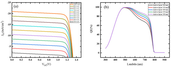 Similarly, quantum efficiency (QE) of the PV cell can be described by the ratio of the numbers of carrier captured by the cell to the incident number of photons of a given energy. It specifies how the device reacts to the various illumination wavelengths [53]. When photons of a given energy or wavelength are absorbed and the resultant minority’s carrier are accumulated, the QE is said to be at unity with that wavelength. QEs with different active layer thicknesses are shown in Figure 3b. QE as a function of lambda is investigated within the range of 300 nm to 900 nm. The QE rise from 300 nm to 800 nm, and the highest peak is observed between 450 nm to 550 nm, following the reduction in the QE and reaching zero. The square shape of the QE curve (ideal condition) is also affected by the active layer thickness of the solar cell, which is observed.