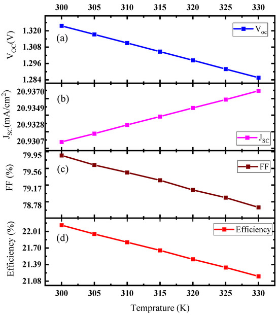 where T is the temperature, and (bandgap at 0 K), β, and α are the material constants. In this simulation, we varied the temperature from 300 K to 330 K while keeping light intensity, parasitic resistance, and thickness of the layers constant. The influence of temperature on the solar cell’s performance, as illustrated in Figure 4, is of significance. At an operating temperature of 300 K, the VOC and FF measures at 1.323 V and 79.86%, respectively. However, as the temperature increases, there is a corresponding decrease in both VOC and FF, as depicted in Figure 4a,c, eventually resulting in values of 1.285 V and 78.65%, respectively. The JSC remains relatively constant around 20.93 mA/m2 (see Figure 4b). However, there is a slight increase from 0.0007 mA/m2 to 0.0070 mA/m2 due to the contribution of thermally generated carriers in addition to the light-generated carriers. The VOC and FF are directly influenced by the adverse effects of temperature, which consequently impacts the overall efficiency of the solar cell. Figure 4d illustrates a decline in efficiency from 22.12% to 21.17%, underscoring the temperature’s detrimental impact.