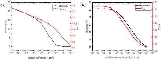 Figure S2 shows variation in performance parameters such as JSC, VOC, FF, and efficiency follow the expected trend, with a visible reduction as the quality of the layer deteriorates (or defects density increase in thin-films). The VOC and JSC decrease from 1.313 V to 0.057 V and 20.77 to 0.06 mA/cm2, respectively. Similarly, FF and efficiency decrease from 79.55% to 24.96% and 22.03 to 0.72%, correspondingly, because of leakage current and parasitic resistance, the light-generated power is dissipated in the cell structure. The defects density of 1 × 1014 has a negligible impact, while above 1 × 1018, an abrupt decrease is noticed in the cell performance parameters. Defect concentrations in the range of 1 × 1014 to 1 × 1017 are considered acceptable for practical application. In our simulation, we chose a defect density of 1 × 1014, at which the efficiency and VOC of the cell is recorded 22.13% and 1.33 V, respectively. The impact of bulk defects on VOC efficiency are combinedly displayed in Figure 5a.