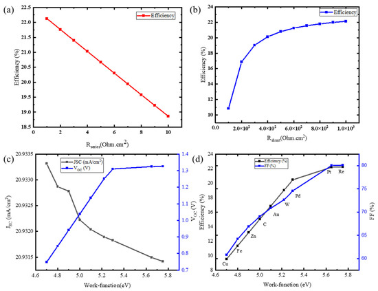 (a) Influence of shunt resistance on efficiency; (b) efficiency of PSC increases with the increase in shunt resistance; (c) impact of work function on VOC and JSC; (d) impact of work function on FF and efficiency.