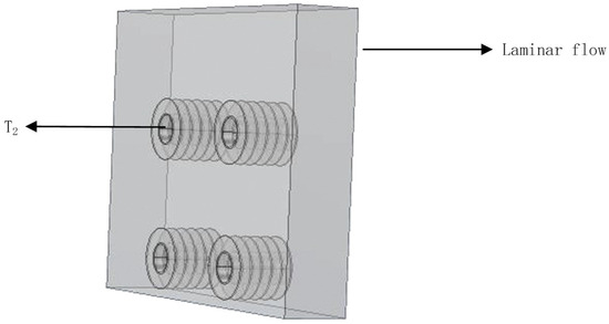 In order to simulate the heat production process of a fin-tube condenser in a heat pump water heater tank, a finite element model was established in COMSOL; the flow and heat transfer control equations were solved with finite element, which used tetrahedral meshes, and the relative tolerance of that model was set as 10−4. The fin-tubes were oriented perpendicularly to gravity to maximize the thermal convection effect. Table 1 shows the characteristics of the used computer.