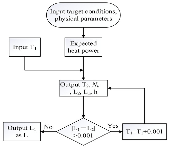 In the formula, Q and Q1 are the proposed power; L (mm) is the tube length; d (mm) and D (mm) are the inner and outer diameters of the tube, respectively; Tm2 is the average temperature of water outside the pipe; T1 and T2 are the internal and external temperatures of the tube wall, respectively. T1, T2 and L were solved using an iterative program (Figure 4), which was verified in several simulations to provide more accurate design parameters for the required tube length L; below is the corresponding flow chart.
