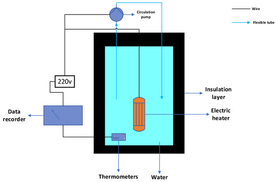 Figure 5 shows a schematic diagram of the experimental setup, where heat loss is minimized by wrapping the tank with an insulation material. A thermometer of an electric heater with a small water circulation pump is placed inside the tank. All were powered by 220 V, while the thermometer was connected to data collection to collect temperature data.