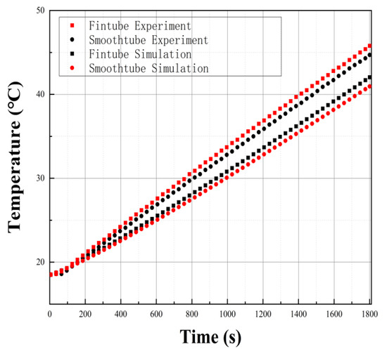 The experiment used a 30 L insulated water tank with a fin-tube electric heater and a smooth-tube electric heater whose parameters, except for the fin parameters, were the same. In consideration of the convective heat transfer effect, the electric heater was placed in the lower part of the water tank, and a small circulating water pump was used to avoid temperature stratification in the water tank. The temperature change detected by the temperature sensor within the water tank for 1800 s was used as a reference for comparison with the temperature change obtained using the CFD method. The error between the two was compared to ensure the feasibility of the CFD method. Figure 6 shows the trend of temperature change inside the water tank obtained through experiments and CFD methods. The results in Figure 6 show that the error between experimental data and CFD data is less than 10%, indicating that the CFD method used in this study is indeed feasible. The y-axis in Figure 6 is the temperature of the water around the heat exchanger.