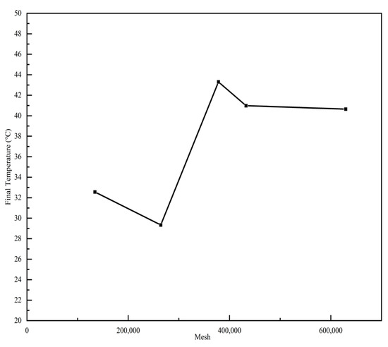 For the proposed model, it can be seen from Figure 7 that when the number of grids was 4 million and more, the final temperature of the model fluctuates around 31 °C and the error does not exceed 5%, so it can be considered that the temperature of this model was independent with the number of grids.