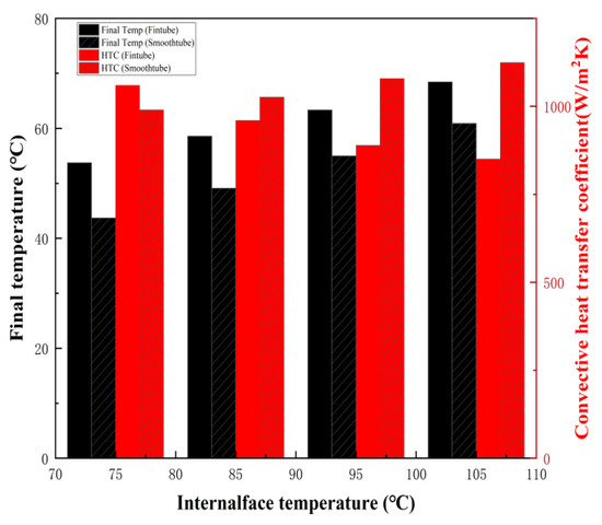 As shown in Figure 8, the heat capacity performance of the fin-tube condenser was better than that of the smooth-tube condenser at different constant wall temperatures. At constant internal wall temperatures of 75, 85, 95 and 105 °C, the heat transfer coefficients of the fin-tube were 1059.55, 959.95, 889.12 and 850.4 W/m2K, respectively, while the heat transfer coefficients of the smooth-tube were 989.92, 1026.15, 1078.7 and 1124.42 W/m2K, respectively. The convective heat transfer coefficients improved by 7.03%, −6.45%, −17.57% and −24.37%. However, overall, the heat transfer coefficients of fin-tubes were 30,400 W/K, 27,785, 26,013 and 24,733 W/K, whereas the heat transfer coefficient of smooth-tubes were 15,174, 16,320, 17,231 and 17,972 W/K. Although the overall heat transfer coefficient of fin-tubes was higher than that of smooth-tubes, the coefficients per unit area were not all higher than that of smooth-tubes, because fin-tubes increased the heat transfer coefficients by increasing external area.