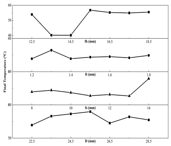 Second simulation experiments were carried out by varying the design parameters of the prototype fin-tube at a constant internal wall temperature. As shown in Figure 9, the final temperature changed with each case after changing each parameter. It was found that when the fin height increased, the final temperature would first drop to 40 °C, and then gradually stabilize at around 58 °C; when increasing the fin thickness, the final temperature was the highest when the fin thickness was 1.3 mm and then decreased and maintained at around 54 °C. The final temperature did not change significantly when the fin pitch was increased from 8 mm to 13 mm, but rose to 58 °C when it increased to 14 mm. The final temperature rose with the inner diameter of the tube until 25.5 mm and was lower than 58 °C from 25.5 mm to 28.5 mm.