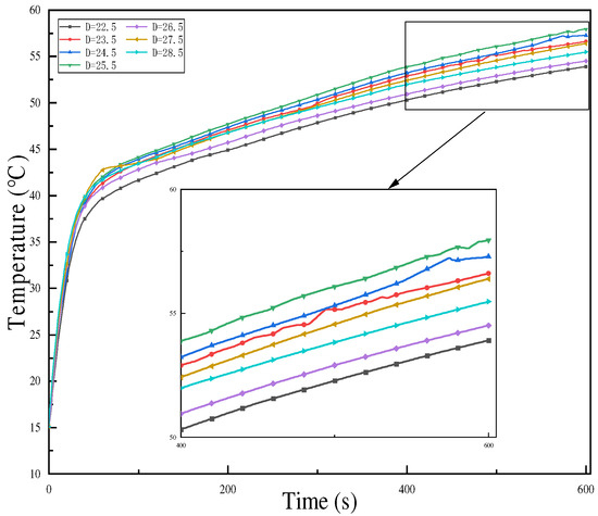 Figure 10 shows the final temperature variation of water heated by different fin-tubes with different inner diameters. From the former results, as the optimum fin thickness was 1.3 mm, the inner diameter of the fin-tube was changed to investigate the effect of different inner diameters on heat transfer efficiency. When the inner diameter of the fin-tube was increased from 22.5 mm to 25.5 mm, the heat transfer coefficients increased by 1.2%, 7.1% and 13.1%, respectively, and then, the heat transfer coefficient declined with the increase in inner diameter. It was found that when the inner diameter of the fin-tube increased, the overall heat transfer coefficient of the fin-tube would first increase and then decrease.
