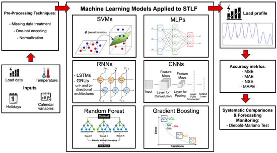 Figure 1 illustrates a flowchart for the STLF process, mapping steps, inputs, outputs and successful machine learning models used to represent the problem.