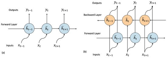 Traditionally, RNN architectures have a unidirectional flow of information, but another alternative for these models is the bidirectional data flow, called bi-RNNs. Unlike unidirectional RNN models, bi-RNNs process data in two directions (forward in time and backward in time) through different layers [41]. Figure 2a illustrates the unidirectional RNN (uni-RNN) and Figure 2b illustrates the bi-RNN.