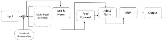 The transformer architecture is based on an encoder–decoder layer using stacked self-attention and layers connected for both the encoder and decoder [12]. The encoder component is a stack of encoders and is characterized by two main layers: a multi-head self-attention mechanism and a feedforward ANN. The decoder component is a stack of decoders, and besides the multi-head self-attention tool and feedforward ANN, it has a third sub-layer between them that makes multi-head and scaled dot-product attention [55]. Therefore, transformers use scaled dot-production attention to estimate the next vector (Figure 3).
