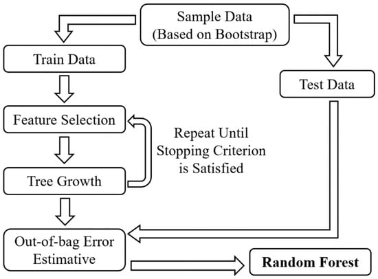 When developing a Random Forest model, the process begins with the selection of input data using the Bootstrap method. This approach estimates parameters through a simulation based in the asymptotic distribution [82]. Once the dataset is chosen for tree construction, specific features for prediction are then selected. The growth of individual trees in the forest continues until a predefined stopping criterion is met. After the trees have been grown, the model’s performance is evaluated using the out-of-bag error. Essentially, this method leverages the data points that were excluded during the bootstrapping process [80]. The error is computed by comparing the prediction from the highest-scoring tree to the actual value of the left-out data. This approach ensures that the Random Forest model is both robust and validated against unseen data. Figure 4 summarizes the main steps for Random Forest development.