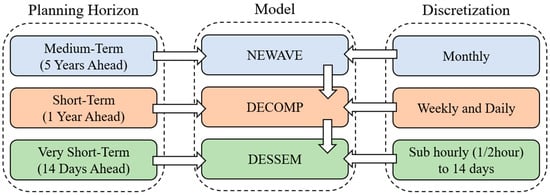 - CEPEL, DESSEM Model: Daily Operation Schedule and Hourly Price Formation of Hydrothermal Systems with Detailed Representation of Generating Units, Intermittent Sources, Consideration of the Electric Grid and Safety Restrictions. 2022. Technical Report. Available online: https://www.cepel.br/wp-content/uploads/2022/05/DESSEM_ManualUsuario_v19.0.24.3.pdf (accessed on 29 October 2023).