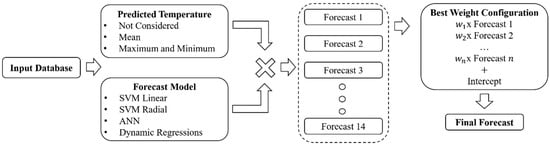 At its core, an ensemble approach combines the outputs of multiple models, each precisely fine-tuned prior to integration. This strategy capitalizes on the strengths of individual models while simultaneously compensating for their respective weaknesses. Ensemble methodologies initially relied on calculating a weighted average of outputs from each constituent model. This simplistic approach ensured that more accurate models held greater importance in the final prediction. However, with advancements in technology and a deeper understanding of ANNs, more sophisticated ensemble techniques have emerged [63]. These new methods not only consider the weighted outputs but also factor in the underlying architecture, training data variability, and potential correlation between models. By harnessing multiple and diverse ANNs, ensemble strategies aim to provide a more robust and consistent forecasting tool. The output of a basic ensemble method is mathematically described by Equation (33).
