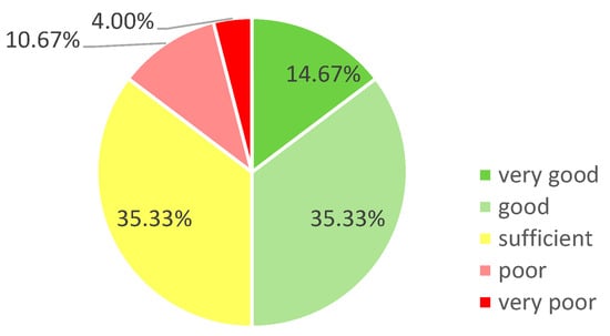 Considering the education of the respondents, the largest group of respondents were those with higher education—70.0% (including higher education with a master’s degree—30.0% of the total, higher education with a PhD or higher—26.0% of the respondents and higher education with an engineering/bachelor’s degree—14.0% of the total, i.e., respectively, 45, 39 and 21 people). The smallest group was those with basic vocational or trade education—0.67% of the total, or 1 person. General secondary education and vocational education were represented by 28 respondents, or a total of 18.66%. Only 3 people or 2.0% were characterized by primary education.