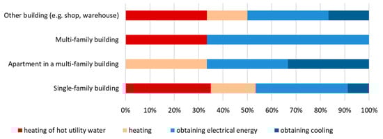 Respondents indicated that more than 30% of people use RES for heating hot water in single-family, multi-family and other (service and residential, commercial; Figure 3) buildings. The multi-family building is dominated by obtaining energy from renewable sources for electricity generation (66.6%). In apartments, multi-family buildings use RES for heating, obtaining electricity and obtaining cooling at comparable levels (33.3%). The least amount of energy obtained from renewable sources is used in single-family buildings for cooling—about 8.7%.