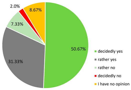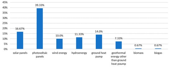 When asked “If there was a choice of building a renewable energy source in the vicinity of your residence, would you choose from the list?” the largest percentage of people surveyed leaned toward photovoltaic panels—39.33% (59 people; Figure 8). The use of energy from solar panels and ground source heat pumps would be opted for, respectively, by 16.67% and 14.0% of respondents. The fewest respondents would opt for biogas and biomass—0.67% (one person).