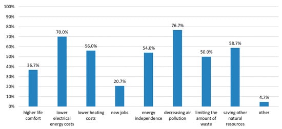 The high proportion of responses indicating a reduction in air pollution from renewable energy production (Figure 7) is not unique. The aspect of reducing air pollutant emissions through renewable energy production was also pointed out by a majority of surveyed Poles in a 2016 study conducted by the Center for Public Opinion Research [28].