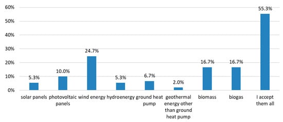 ’In the subsequent question, respondents were asked to indicate the type of RES they disapprove of in the vicinity of their residence (Figure 6). The responses show that a large majority of respondents (55.3%) accept all sources. Significantly fewer respondents disapprove of wind power (24.7%) due to “noise, interference with natural air intake, adverse effects on health in the immediate vicinity and on birds, disfigurement of the landscape, disruption of spatial order, and nuisance to living comfort”. A comparable number of respondents—16.7%—disapprove of biomass (“possible odor emissions”) and biogas (“possible odor, risk of failure, risk of explosion”). 10% of respondents disapprove of photovoltaic panels due to the inconvenience to living comfort. More than 6.7% of respondents disapprove of ground source heat pumps (“noise”), and 5.3% of respondents disapprove of solar panels (no justification) and hydropower (“noise”).