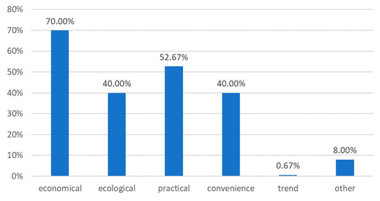 The most important factors influencing households’ decisions to choose an energy source at their place of residence are economic (70.0%) and practical (52.67%; Figure 7). Respondents attribute high importance to ecology and convenience, with 40.0% of respondents giving this response in both cases. In contrast, trend was the least important, indicated by one respondent (0.67%). 48.67% of respondents expressed the opinion that, given a choice in their consumer decisions, they are guided by the source of energy.