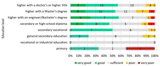 Respondents who rated their knowledge of RES as very good and good presented higher education with a master’s degree (32.0%; Figure 10). Similarly, respondents with a university degree and a doctorate (or higher) rated their knowledge as very good and good (29.3%). A sufficient level of knowledge is represented by respondents with general secondary education (16.9%). In contrast, those with primary education (16.6%; 1 person), post-secondary or a high-school diploma education (16.6%; 1 person), higher education with an engineering/bachelor’s degree (16.6%; 1 person) and higher education with a master’s degree (50.0%; 3 people) rated their knowledge in the subject area very poorly. Of the surveyed population, 50.0% rated their knowledge of RES as very good and good, 35.33% rated it as sufficient and 14.6% rated it as poor and very poor.