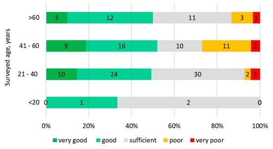 In this study, a comparison was made between the respondents’ knowledge status and their age (Figure 11). Quite a large group that assessed their knowledge of RES as very good and good were respondents aged 21–40 (45.3%). At the same time, 56.6% in this age group described their knowledge of RES as sufficient. 41.0% of respondents in the 41–60 age range indicated knowledge of RES to be very good, 30.2% to be good, and 68.75% to be poor. In the 60+ age group, the highest percentage of respondents indicated their knowledge of RES to be poor. No one stated that they had very good knowledge in the studied area in the age group <20 years.